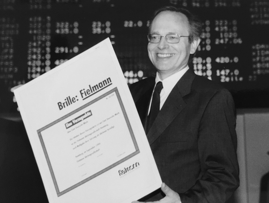 1994 wagt Günther Fielmann den Gang an die Börse: Fünf D-Mark kostet Fielmanns sogenannte Volks-Aktie, die zur erfolgreichsten Neu-Emission des Jahres wird (Bild: Fielmann)