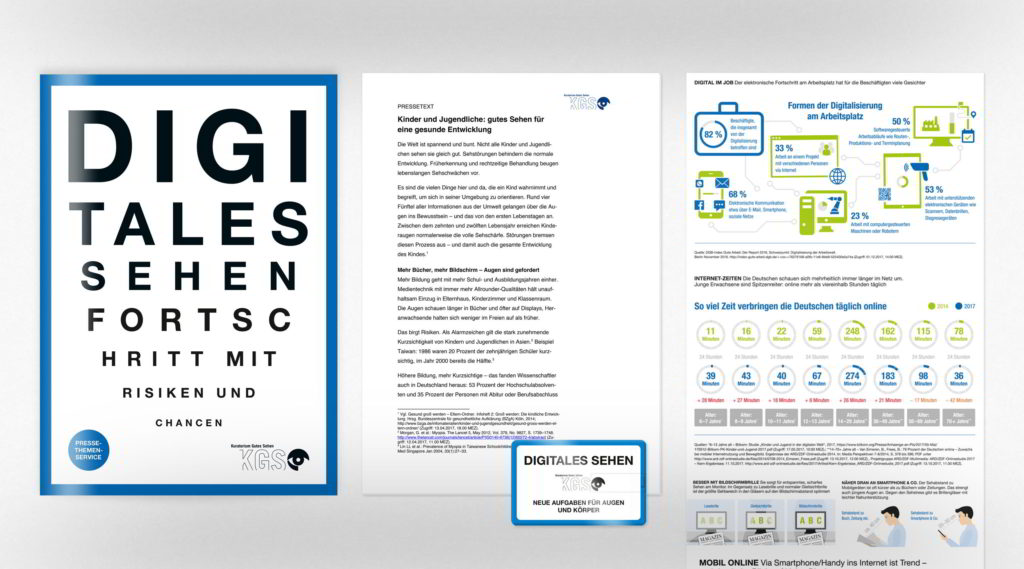 Anfang Juni erfolgte der Versand des aktuellen Themenservices „Digitales Sehen – Fortschritt mit Risiken und Chancen“ an die Medienvertreter. Daraufhin titelte als Erster BILD Online (Visits 12.626.697) unter Nennung des KGS am 24. Juni 2018 „Zahlen belegen, was viele befürchtet haben: Das Handy macht unsere Augen kaputt … und nicht nur die“. Parallel dazu veröffentlichte die BILD-Zeitung in ihrer Print-Ausgabe (verbreitete Auflage: 1.630.870) vom 25. Juni 2018 den halbseitigen Beitrag „Generation Kurzsichtig – Das Handy macht unsere Kinder krank … und nicht nur die“. Weitere Online-Beiträge gab es unter anderem bei Computerbild.de (Visits: rund 1,2 Mio.), Brigitte.de (406.046) und Giga.de (677.256).