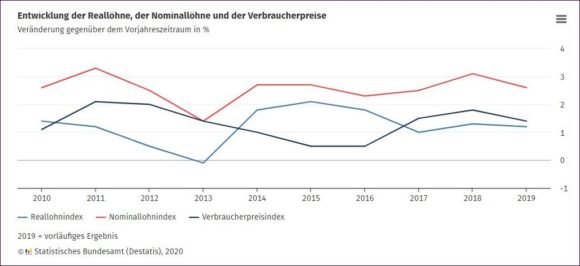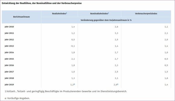 (Wiesbaden) – Der Reallöhne in Deutschland sind im Jahr 2019 um durchschnittlich 1,2% gegenüber dem Vorjahr gestiegen. Wie das Statistische Bundesamt (Destatis) nach vorläufigen Ergebnissen der Vierteljährlichen Verdiensterhebung weiter mitteilt, lagen die Nominallöhne 2019 um 2,6% über dem Vorjahreswert. Die Verbraucherpreise erhöhten sich im selben Zeitraum um 1,4%.