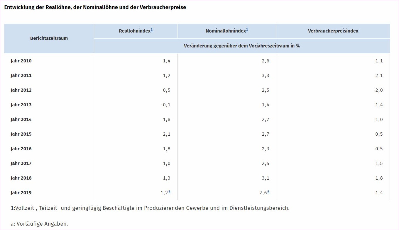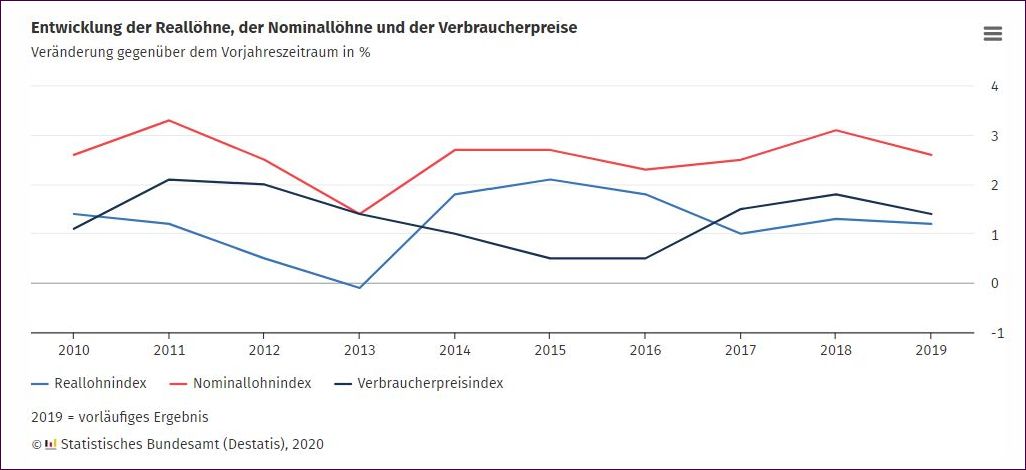 Diese Angaben sind vorläufige Ergebnisse über die nominale (nicht preisbereinigte) und reale (preisbereinigte) Entwicklung der Bruttoverdienste in Deutschland im Jahr 2019. Detaillierte und endgültige Daten für das 4. Quartal 2019 und das Jahr 2019 werden voraussichtlich Ende März 2020 veröffentlicht.
