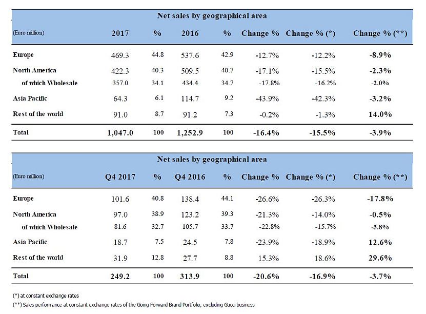 Im vierten Quartal 2017 belief sich der vorläufige Nettoumsatz von Safilo(1) auf 249,2 Mio. Euro, währungsbereinigt verringerte er sich um 53 Mio. Euro gegenüber 2016. Der Nettoeffekt aus dem Ausstieg aus der Gucci-Lizenz und dem Abschluss des Liefervertrages trug 44 Millionen Euro zum Rückgang bei, während der Nettoumsatz des Going-Forward-Markenportfolios währungsbereinigt um 3,7% zurückging (-5,2% ohne Einzelhandel).