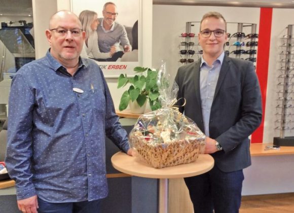 Lukas Damerow (rechts) überreicht LowVision-Berater Falko Jakobs von Optik Erben, Kiel, den Präsentkorb für die 2.000ste Versorgung im Rahmen der Kooperation mit Schweizer und Optelec