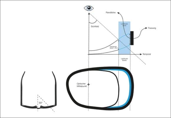 Für ein Brillenglas mit hohen Minuswerten gelte dann zum Beispiel, dass die Lentikularzone genau an dem Punkt beginnt, an dem das Brillenglas eine Dicke von vier Millimetern erreicht – von dort aus dehnt sie sich temporal aus. Erreicht das Brillenglas eine solche Übergangsdicke, das Sichtfeld ist aber kleiner als 50°, wird der Startpunkt der Lentikularzone verschoben, um ein Sichtfeld von 50° zu gewährleisten.