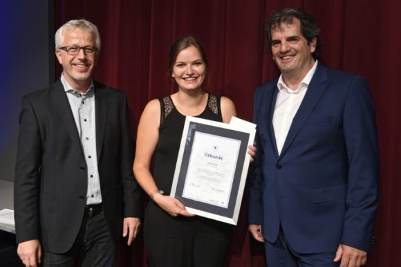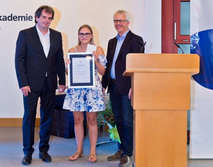 Matthias Müller (links) und Peter Kupczyk (rechts) ehren Lena Wukadinowitsch für das zweitbeste Gesamtergebnis bei der Gesellenprüfung Teil 2 in Baden-Württemberg (Bild: KD Busch)