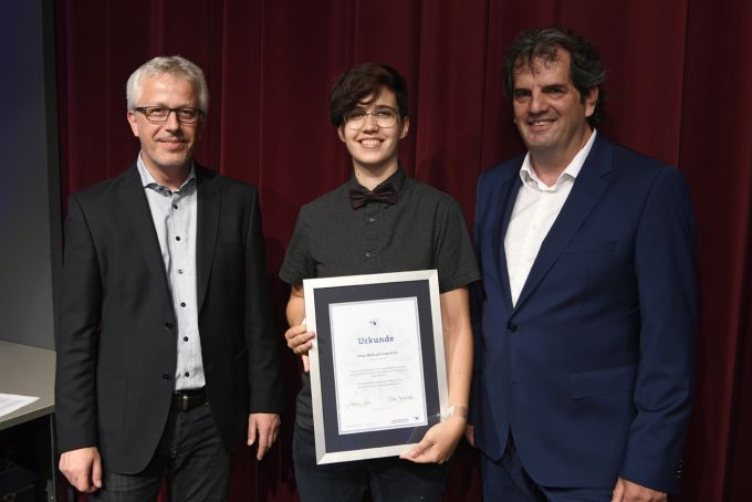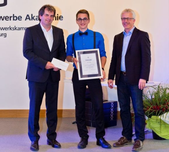 Matthias Müller (rechts) und Peter Kupczyk (links) ehren Tobias Hug für das drittbeste Gesamtergebnis bei der Gesellenprüfung Teil 2 in Baden-Württemberg (Bild: Markus Herb)