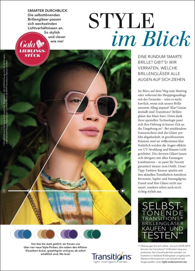 Für die selbsttönenden Transitions-Brillengläser startet im März eine neue Media-Kampagne, darunter auch Schaltungen im People- und Lifestylemagazin Gala, Advertorials auf gala.de und im neuen Trendmagazin JWD von Joko Winterscheidt. Ein umfangreiches Werbe-Paket soll die Lifestyle-Kampagne abrunden und beim Augenoptiker vor Ort für Aufmerksamkeit sorgen.