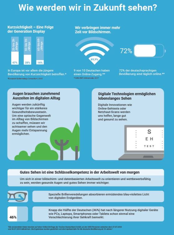 Gutes Sehen ist eine Grundvoraussetzung, um auf dem Arbeitsmarkt langfristig erfolgreich und wettbewerbsfähig zu sein. Die zunehmende interaktive Vernetzung bestimmt unser Berufsleben und sorgt dabei für dauerhaften digitalen Sehstress. Bereits dreiviertel aller Beschäftigten arbeiteten rund um die Uhr am Bildschirm(3) – umso wichtiger sei es hier, dass sich Arbeitgeber und -nehmer der Verantwortung, auch sich selbst gegenüber, im Umgang mit Laptop, Smartphone und Co. Bewusst würden. Dazu gehöre eine Sensibilisierung für die möglichen negativen Auswirkungen auf die Augengesundheit.
