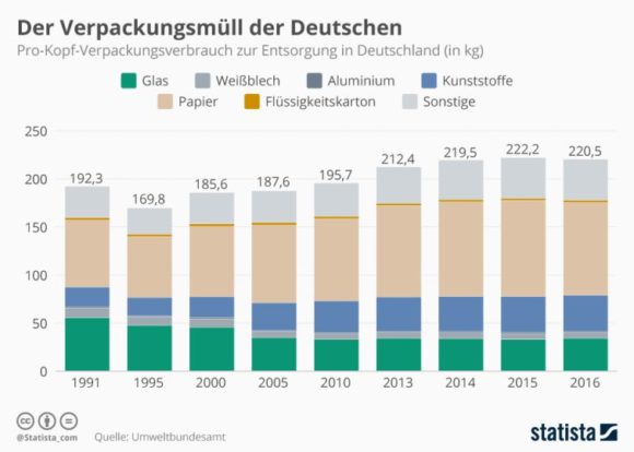 Die Deutschen produzieren nach wie vor zuviel Verpackungsmüll. Im Jahr 2016 seien 18,16 Millionen Tonnen angefallen, wie das Umweltbundesamt mitteilte: 0,05 Prozent mehr als im 2015 und 220,5 Kilogramm pro Kopf und Jahr. Damit liege der Verpackungsverbrauch in Deutschland deutlich über dem europäischen Durchschnitt von 167,3 Kilo pro Kopf. 47 Prozent davon gingen auf das Konto von privaten Verbrauchern.