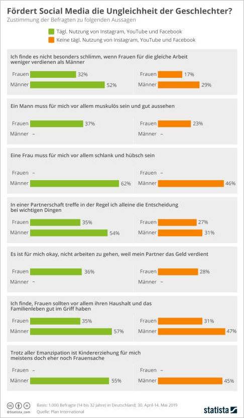 Für die Studie von Plan International wurden 1.000 junge Menschen zwischen 14 und 32 Jahren zu ihrer Sicht der Rollenbilder befragt, mit dem Ergebnis: Je stärker die jungen Menschen Social Media nutzten, desto stärker ausgeprägt seien die stereotypen Rollenbilder.