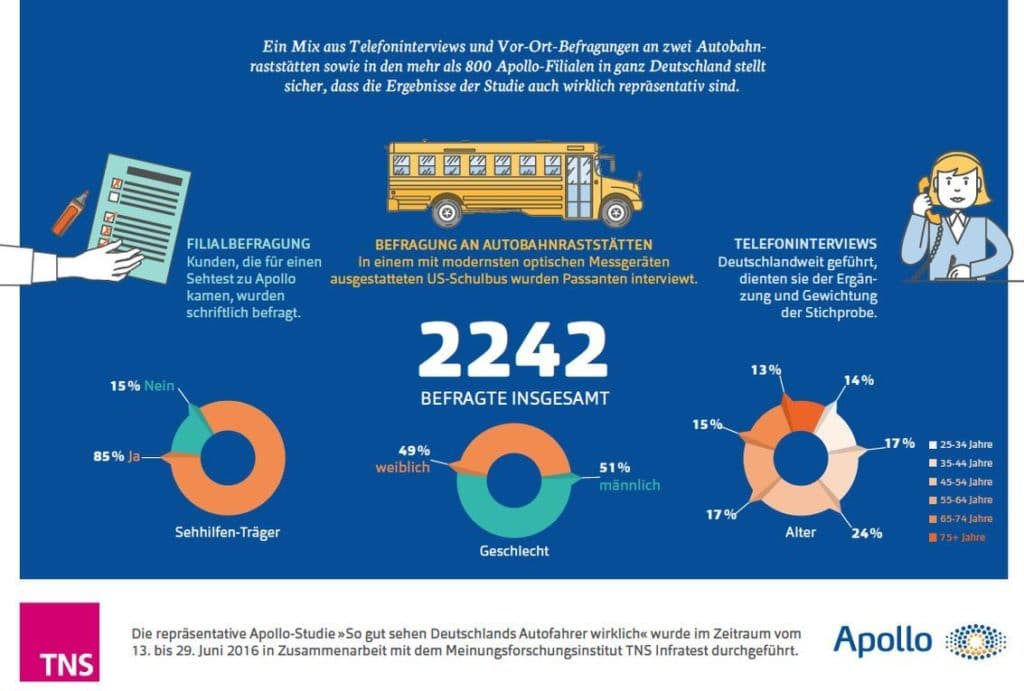 Eine umfangreiche Untersuchung von Apollo und TNS Infratest belegt: 74 Prozent der deutschen Autofahrer schätzen die eigene Sehkraft falsch ein, 80 Prozent befürworten eine Sehtest-Pflicht. Im Sommer 2016 wurden mehr als 2.200 Autofahrer an Autobahnraststätten und in den Apollo-Filialen in Deutschland befragt und anschließend untersucht.