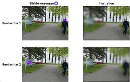 Ein und dasselbe Bild, aber eine ganz andere Wahrnehmung: Während sich die Blickbewegungen von Beobachter 1 auf das Gesicht der Person richten, fixiert Beobachter 2 die Infotafel und blendet die abgebildete Person fast komplett aus (Foto/Grafik: Fillip Schmidt, Ben de Haas)
