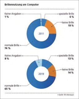 Das neue Homeoffice-Zeitalter hat manchem Unwissenden seine Sehschwäche erst bewusst gemacht. Die für das Sehen am Bildschirm entwickelten Brillenglastypen erzielten in den vergangenen Monaten Zuwachsraten im zweistelligen Bereich. Doch von den 17 Mio. Fehlsichtigen, die hierzulande ihren Job am Bildschirm erledigen, tragen nur 13 Prozent eine Bildschirmarbeitsplatzbrille. Auch das ein großes Potenzial.