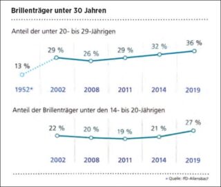 Und noch ein Trend: Immer mehr 20- bis 29-Jährige tragen Brille. 2008 waren es 26, jetzt sind es 36 Prozent. Zunehmende Bildschirm- und Smartphone-Nutzung sind maßgebliche Gründe.