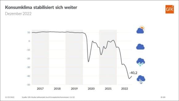 „Die Konsumenten erwarten, dass eine Rezession in naher Zukunft nicht mehr zu vermeiden ist. Damit sind sie sich einig mit den Wirtschaftsexperten, die ebenfalls davon ausgehen, dass das Bruttoinlandsprodukt im kommenden Jahr um etwa ein halbes Prozent schrumpfen wird. Dabei wird auch der private Konsum 2023 keinen positiven Beitrag leisten können.“