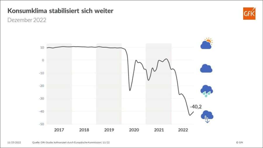 Zuletzt haben eine Reihe von Energiepreisen etwas nachgegeben. Zudem wurde eine Entlastung für Dezember durch die Übernahme des Abschlags beschlossen. Dies führt zwar zu einem leichten Rückgang des Pessimismus der Verbraucher, solange jedoch weiterhin Zweifel an einer problemlosen Energieversorgung bestehen, wird auch die Inflation hoch bleiben und damit eine spürbare und nachhaltige Erholung beim Konsumklima ausbleiben.