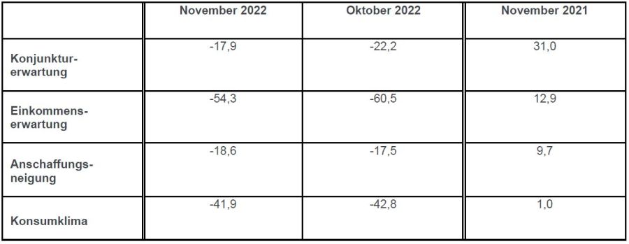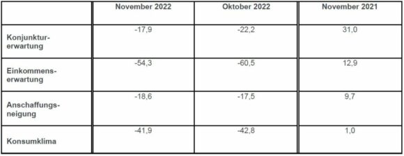 Nach dem Rekordtief im September 2022 legte die Einkommens-Erwartung bereits zum zweiten Mal in Folge moderat zu. Der Indikator gewann im November 6,2 Punkte hinzu und steigt damit auf –54,3 Zähler. Im Vergleich zum entsprechenden Zeitraum des Vorjahres beträgt das Minus noch immer mehr als 67 Punkte.