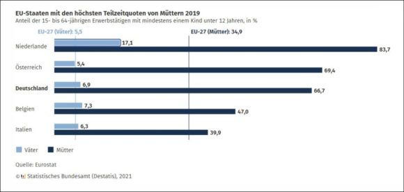 Verglichen mit anderen Mitgliedstaaten der Europäischen Union ist die Teilzeitquote in Deutschland allerdings besonders hoch: 66,7 % der Frauen mit mindestens einem Kind unter 12 Jahren arbeiteten 2019 in Teilzeit, im EU-Durchschnitt waren es nur 34,9%. Damit liegt Deutschland auf Platz 3 unter den EU-27, eine höhere Teilzeitquote bei Müttern jüngerer Kinder haben nur die Niederlande (83,7%) und Österreich (69,4%).