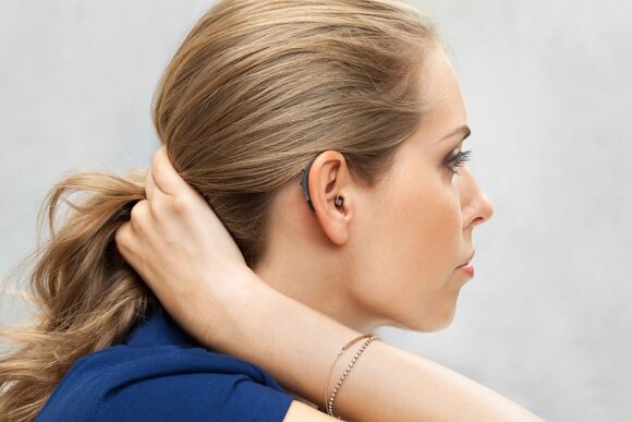 Junge Frau mit Hörgerät (Bild: BVHI)