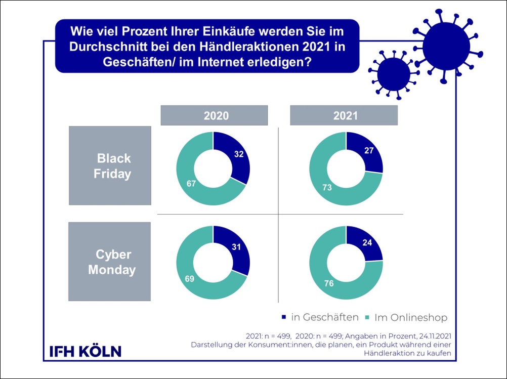 Während 2020 noch 32 Prozent angaben, am „Black Friday“ stationär einzukaufen, planen dies in diesem Jahr nur noch 27 Prozent. Ähnlich die Tendenz auch für den „Cyber Monday“: Hier verlieren die stationären Geschäfte sieben Prozentpunkte gegenüber dem Vorjahr.