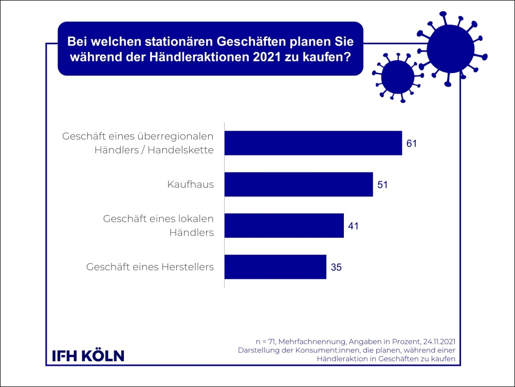 Und wie sieht es stationär aus? In den Geschäften vor Ort sind es vor allem die großen Handelsketten und überregionalen Händler, bei denen Cyber-Week-Schnäppchen ergattert werden. Hier plant die Mehrheit (61 %) der befragten Konsument:innen, die bei den Aktionstagen stationär shoppen, ihre Käufe zu tätigen.