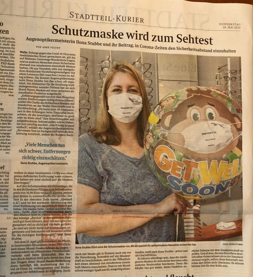 Ilona Stubbe verkaufte diese Masken in den Geschäften des Bremer Brillenhauses und konnte sich kurz nach dem Start der Aktion bereits über die Veröffentlichung des dazugehörenden Presseberichts freuen. „Ich habe meinen Augen nicht getraut, als ich am Frühstückstisch die Zeitung aufschlug und den Pressebericht mit einem Foto von mir gesehen habe“, freut sie sich. „Normalerweise bin ich ja nicht diejenige, die in der Zeitung posiert, aber das war schon ein tolles Gefühl“, lacht sie.