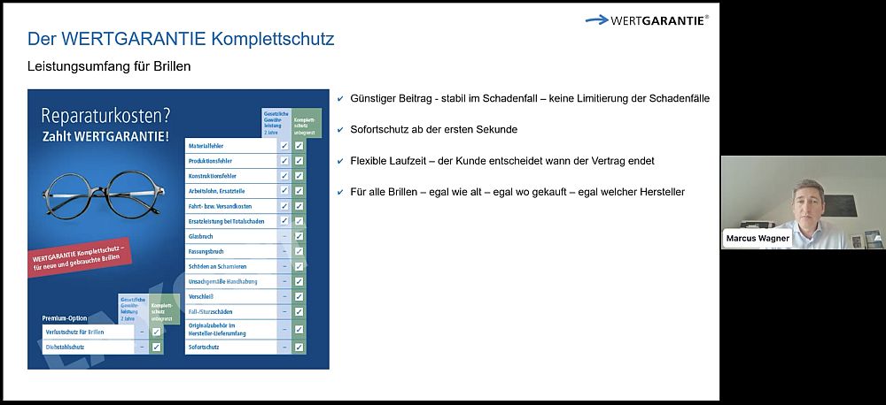 Im November 2025 gab das 30-minütige partnerauge-Webinar Auskunft zum Angebot von Wertgarantie, offensichtlich überzeugend, denn am 26. März war Marcus Wagner mitsamt der Augenoptikerin Josephine Giese noch einmal zu Gast (Links zu den Aufzeichnungen weiter unten). (Foto: Screenshot partnerauge)