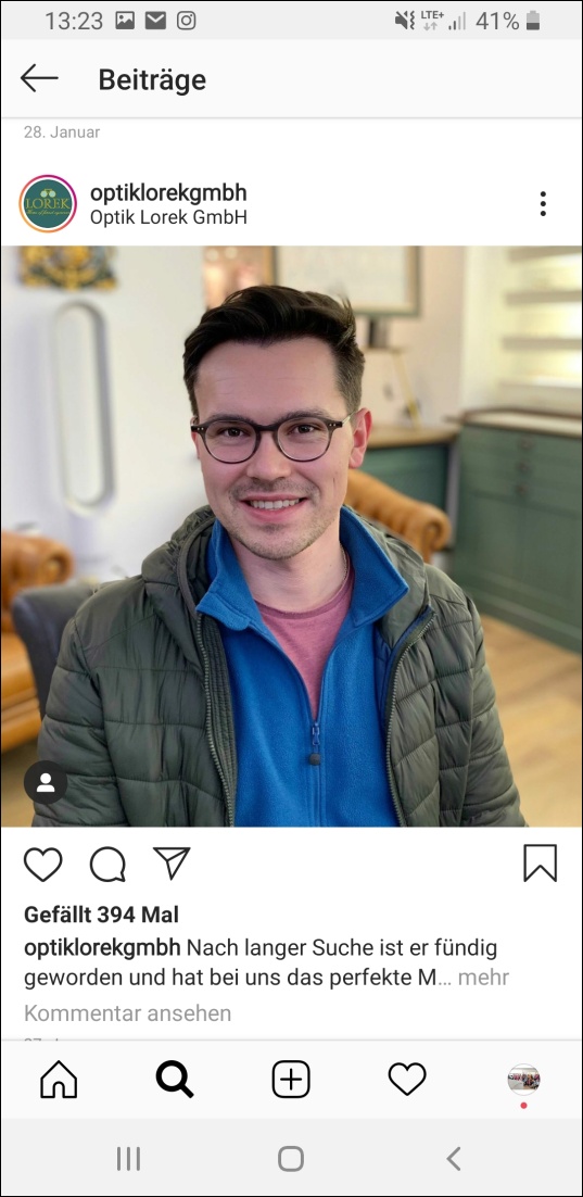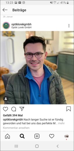 Im November 2019 nutzten rund 20 Millionen Deutsche fast täglich Instagram. Das entspricht fast einem Viertel der Einwohnerzahl. Wer sich als Augenoptiker auf Instagram tummelt, kann punkten wie Karola Lorek aus Regensburg. Ihr Account Optik Lorek verfolgt ein strenges Konzept: Dem Foto der Fassung auf weißem Grund – mal frontal, mal schräg von der Seite – folgt das Portrait des Brille tragenden Kunden, der sich für dieses Modell entschieden hat. Dazu werden Marke und Besonderheiten wie Verspiegelung und Beschreibungen gestellt. „Edel, zeitlos, schön“ oder etwa „goldverspiegelt“.