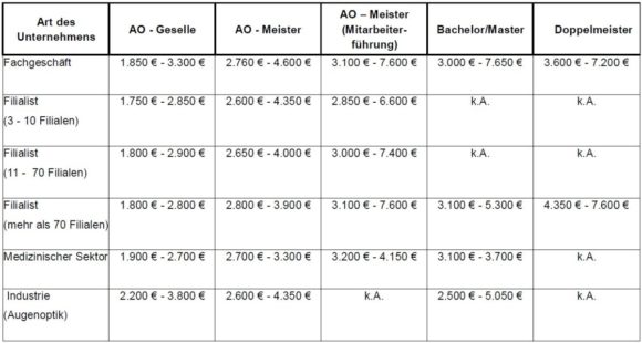 Die Spannen in den einzelnen Gehaltsgruppen differieren teilweise um mehr als 100%. Dies ist beachtenswert. Dies lässt darauf schließen, dass es Firmen gibt die ihre Mitarbeiter durchaus anforderungs- und qualifikationsgerecht bezahlen. Interessant wäre die Erhebung der Häufigkeit(!) der Gehaltshöhe in den einzelnen Gruppen! Eine Gaußsche Normalverteilung wir eine solche Erhebung nicht (!) zeigen. Eher wird es so sein, dass das Maximum im unteren Drittel zu finden sein wird. Die ist in angebracht der Gewinnmargen von mehr als 300% bei Brillengläsern und Fassungen eine Schande. Wenn ein Augenoptikermeister gerade mal 600,–€ über dem Niedriglohnsektor verdient. Dies nach meist 5 Jähriger Ausbildungszeit. (Das sind 10 Semester!)