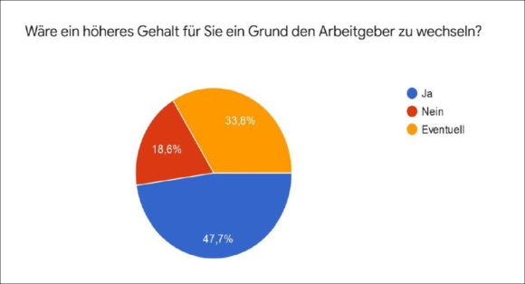 48% der Befragten sprachen sich dafür aus, aufgrund eines höheren Gehaltes den Arbeitgeber zu wechseln, was bei dem Anteil derer, die unzufrieden mit ihrem Gehalt sind, zu erwarten war. 34 % sind unsicher. Daraus lasse sich laut Beutler Saghari & Partner schließen, dass auch Teilnehmer, die mit ihrem Gehalt eigentlich zufrieden sind, über einen Wechsel nachdenken würden. Nur für 19% der Befragten sei ein höheres Gehalt kein Grund, den Arbeitgeber zu wechseln.