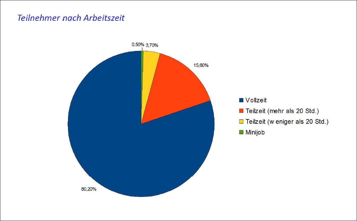 80% der Befragten befinden sich in einer Vollzeitbeschäftigung. 16% arbeiten mehr als 20 Std./Woche. Vergleichsweise niedrig falle der Anteil der Befragten aus, die weniger als 20 Std./Woche arbeiten. Ihr Anteil liegt bei 4%. Weniger als 1% der Befragten übten laut Umfrage ihre Tätigkeit als Minijob aus.