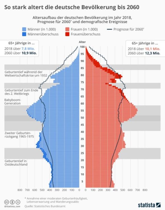 Das Statistische Bundesamt erstellt immer wieder Bevölkerungsprognosen, um darzustellen, wie sich die deutsche Bevölkerung entwickelt. Die Alterspyramide in Deutschland entwickele demnach bis 2060 immer mehr die Form einer Urne – unten schmal und nach oben breiter werdend. Diese Form entstehe deshalb, weil zum einen die Geburtenzahlen abnehmen und zum anderen die Lebenserwartung zunimmt.