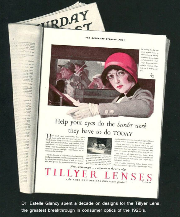 Doch es kam anders. 1918 bot American Optical, der größte Anbieter von Brillen in den USA, der damals 35-Jährigen eine Chance. Dr. Edgar D. Tillyer, der dortige Direktor für Entwicklung, war davon überzeugt, dass Glancys Fähigkeiten die wichtigsten Forschungsprojekte des Unternehmens vorantreiben könnten. Tatsächlich wissen nur wenige, dass die mathematische Arbeit, die den Durchbruch seines Brillenglases ermöglichte, von Estelle Glancy geleistet wurde. Das neue „Tillyer Brillenglas“ stellte den bedeutendsten Fortschritt in der Sehkorrektur der 1920er Jahre dar. Es korrigierte die axialen Aberrationen der Optik und vergrößerte damit die Abbildungsschärfe des Glases bis in die Ränder.