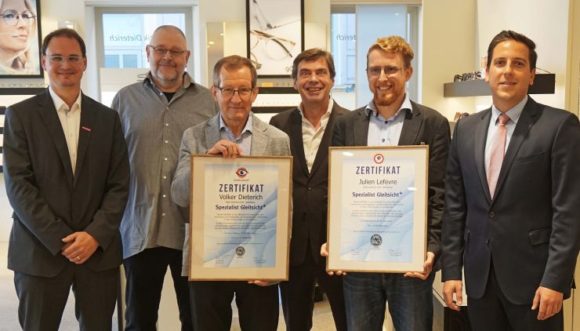 Für ihre Leistungen auf dem Gebiet der Gleitsichtbrillen-Beratung und -Versorgung erhielten Volker Dieterich und Julien Lefevre von Optik Dieterich in Heidelberg das Zertifikat zum „Spezialisten Gleitsicht +“ der Wissenschaftlichen Vereinigung für Augenoptik und Optometrie (WVAO).