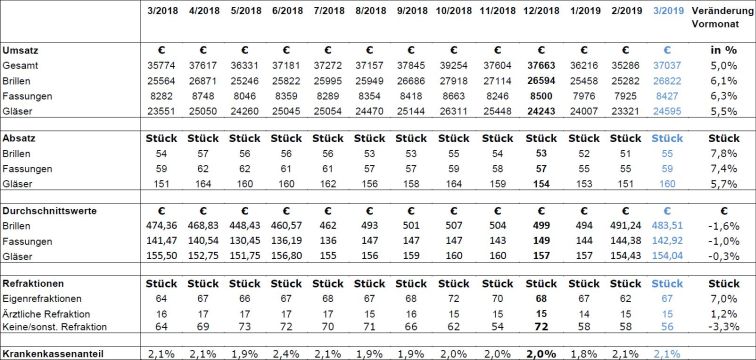 Die folgende Tabelle zeigt die Entwicklung der teilnehmenden Betriebe seit März 2018. Die letzten zwölf Monate sind gekennzeichnet von einem stetigen Auf und Ab. Der Januar 2019 startet verhalten – im Februar 2019 gehen die Stückzahlen und Umsätze erneut zurück. Die Entwicklung im März 2019 ist positiv. Bezogen auf den (schlechten) Februar gehen die Brillen-Stückzahlen um knapp acht Prozent nach oben. Die Durchschnittspreise sind leicht rückläufig. Der Brillenoptik-Umsatz steigt um fünf Prozent.