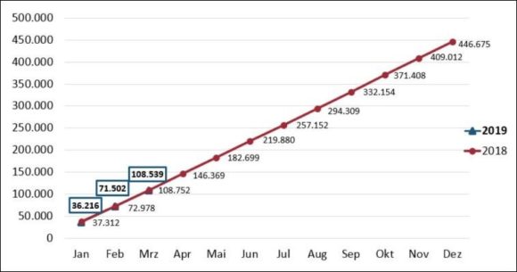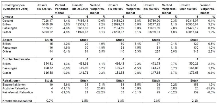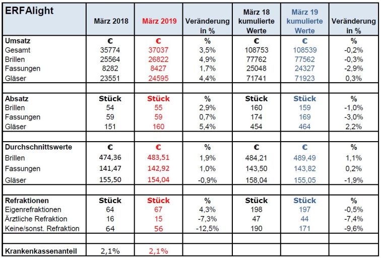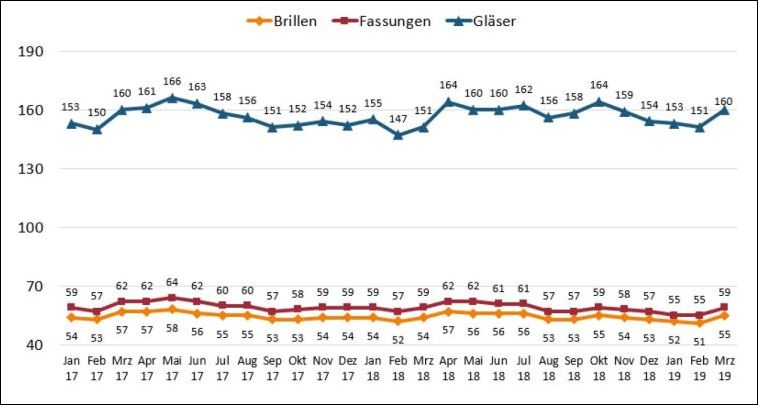 Die Stückzahlen der verkauften Brillen steigen um knapp drei Prozent, der Brillen-Durchschnittspreis geht um knapp zwei Prozent nach oben. Der Krankenkassen-Umsatz liegt bei 2,1 Prozent. Die kumulierten Zahlen für das erste Quartal 2019 weisen einen bezogen auf das Vorjahr stagnierenden Brillenoptik-Umsatz bei leicht zurückgehenden Brillen-Stückzahlen aus.