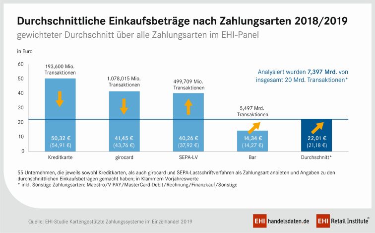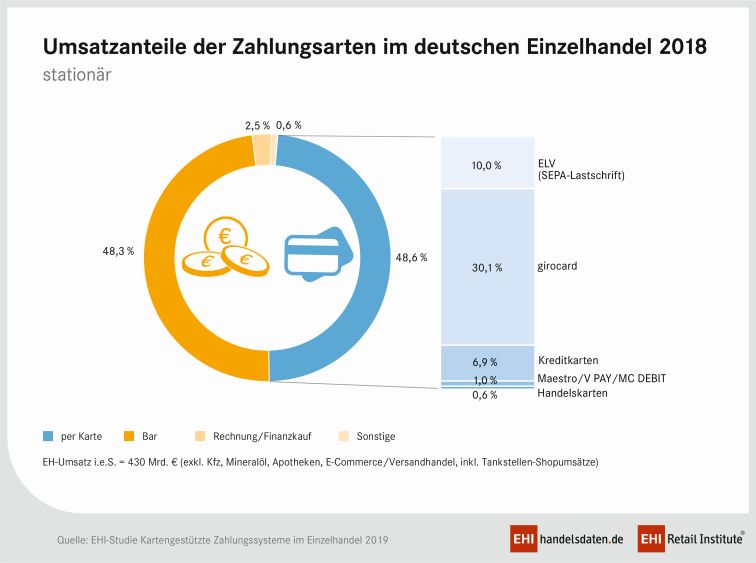 Einer Studie des EHI Retail Institute zufolge sinkt bei den Zahlungsarten der Umsatzanteil von Bargeld weiter und lag 2018 erstmalig unter dem der Karten mit 48,6 Prozent am Gesamtumsatz des Einzelhandels i.e.S. Knapp darunter lagen die Bar-Umsätze mit einem Anteil von 48,3 Prozent (minus 1,7 Prozentpunkte). Haupttreiber dieser Entwicklung sei vor allem das Girocard-System der Deutschen Kreditwirtschaft gewesen, das auf einen Anteil von 30,1 Prozent (plus 3,8 Prozentpunkte) kommt.