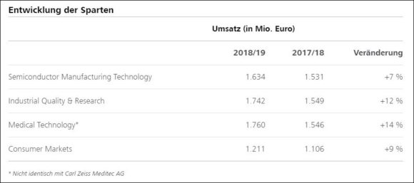 In allen vier Sparten habe die Zeiss Gruppe in 2018/19 ein robustes Wachstum verzeichnet. Eine sehr gute wirtschaftliche Entwicklung zeigte die Sparte Semiconductor Manufacturing Technology und erreichte so einen Umsatzrekord – auch dank der Markteinführung der EUV-Technologie. Die ersten hochwertigen Endgeräte mit Chips, die mit Zeiss EUV-Optiken produziert wurden, sind bereits auf dem Markt verfügbar. Die Sparte Industrial Quality & Research spürte im Bereich Messtechnik und Qualitätssicherung die schwache Entwicklung der Automobilmärkte, konnte aber durch die Akquisition der GOM GmbH zusätzliches Wachstum in Oberflächenmessung und -digitalisierung generieren. Das Mikroskopie-Geschäft habe sich stabilisiert und übertraf die Erwartungen.