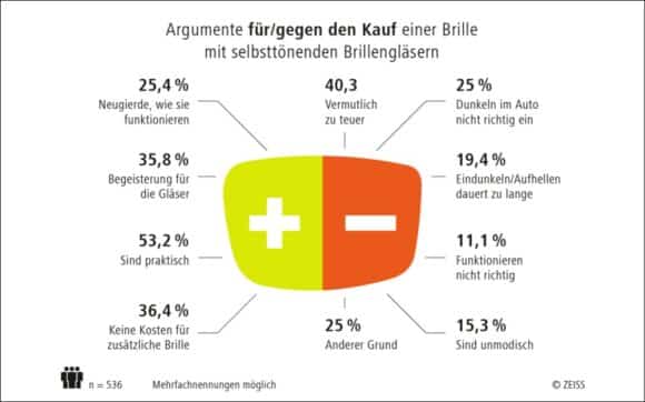 Auf die Frage, warum die Befragten keine selbst tönenden Brillengläser kaufen würden, gaben 40 % an, dass sie vermutlich zu teuer seien, ein Viertel würde keinen Kauf in Betracht ziehen, weil diese Brillengläser im Auto nicht richtig eindunkeln. Ca. 20 % gaben an, dass der Eindunklungs-bzw. Aufhellungsprozess zu lange dauert (Mehrfachnennung möglich; gestützt).