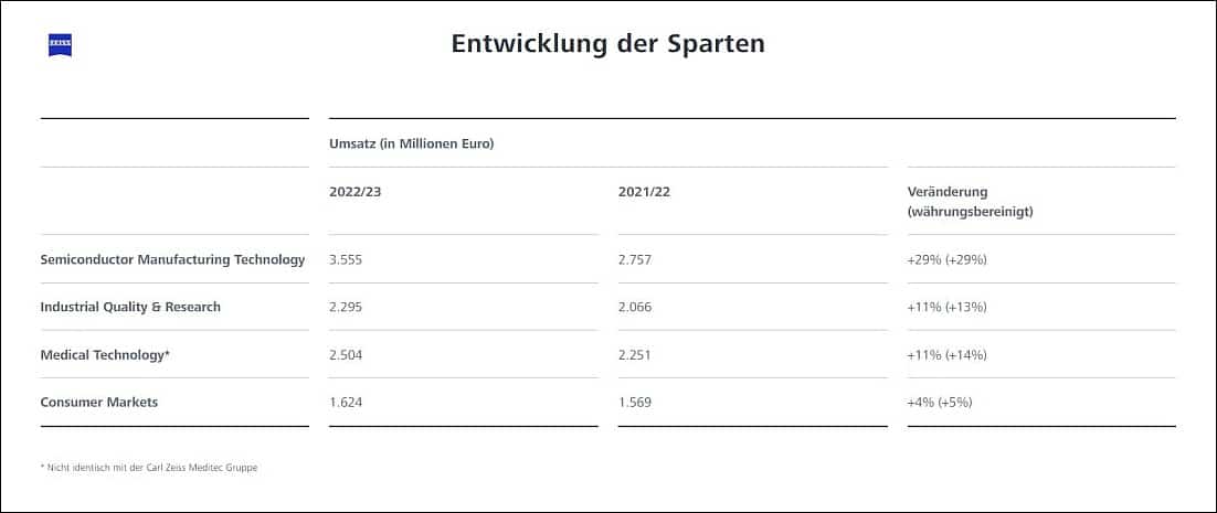 Die Zeiss Gruppe konnte das dynamische Umsatzwachstum mit einer Wachstumsrate auf dem sehr hohen Niveau des Vorjahres fortsetzen. Im Geschäftsjahr 2022/23 (Bilanzstichtag: 30. September 2023) stieg der Umsatz erstmals in der Geschichte des Unternehmens auf über 10 Milliarden Euro (Vorjahr: 8,8 Mrd. Euro, +15 %). Auch das Ergebnis vor Zinsen und Steuern (EBIT) lag mit 1,7 Milliarden Euro über dem Vorjahresergebnis (Vorjahr: 1,6 Mrd. Euro).