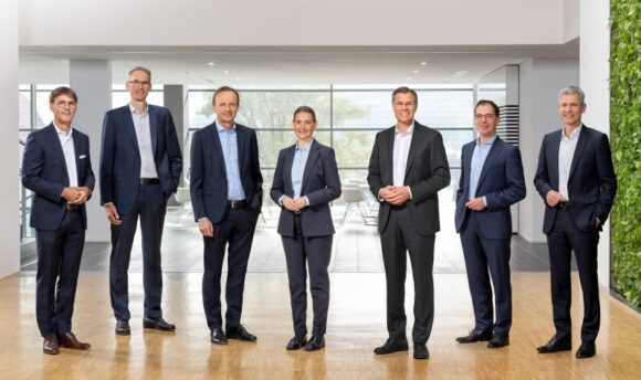 Der Vorstand der Carl Zeiss AG (von links): Sven Hermann (Consumer Markets), Dr. Markus Weber (Medical Technology), Dr. Christian Müller (Finanzen), Susan-Stefanie Breitkopf (Chief Transformation Officer), Dr. Karl Lamprecht (Vorstands-Vorsitzender), Dr. Jochen Peter (Industrial Quality & Research) und Andreas Pecher (Semiconductor Manufacturing Technology (Bild: Zeiss)