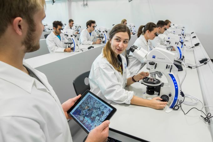 Gemeinwohl bedeutet für den Konzern in Oberkochen, mit modernster Technologie auch Wegbereiter für junge Forschungstalente zu sein: Am College of Engineering der Swansea University, Wales, UK lernen Studierende, mit voll vernetzten Mikroskopen von Zeiss Materialproben zu analysieren (Bild: Carl Zeiss AG)