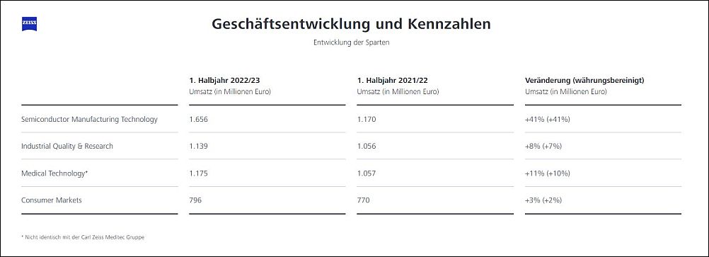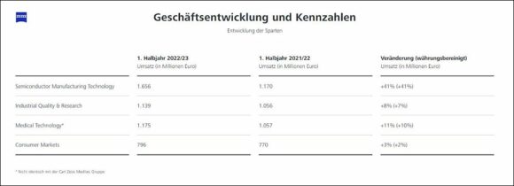 Zeiss Gruppe: Zahlen zu den Sparten im ersten Halbjahr GJ 2022 / 2023 (Quelle: Zeiss)