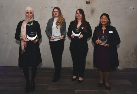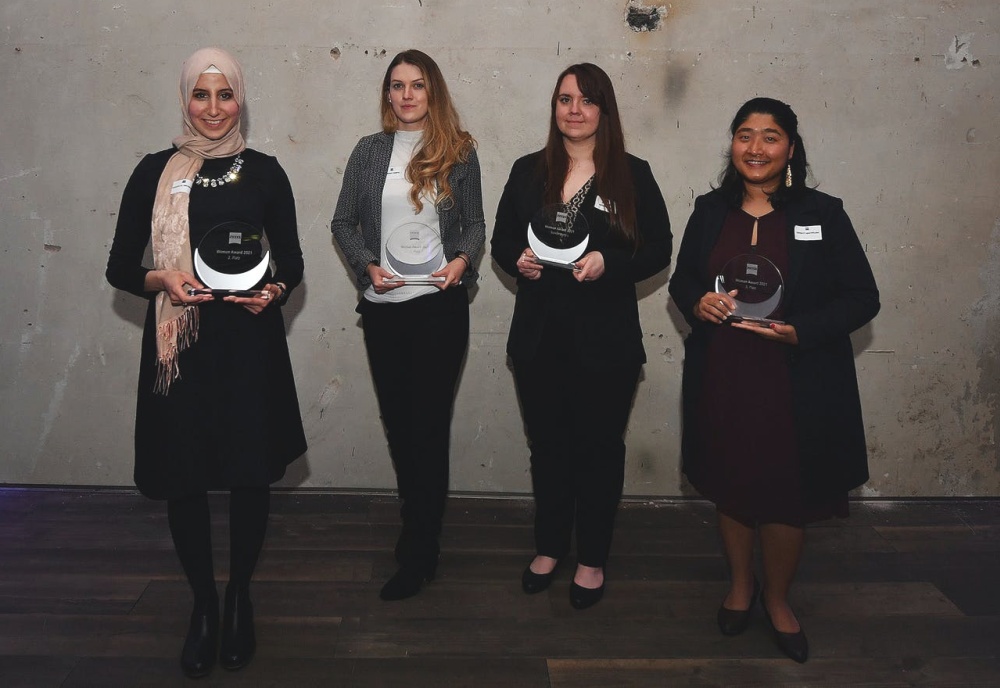 Die Preisträgerinnen des 11. Zeiss Woman Awards (von links): Houda El-Messari (Platz 2), Corina Hampel (Platz 1), Sarah-Lee Mendenhall (Sonderpreis) und Drishti Maharjan (Platz 3) (Bild: Zeiss)