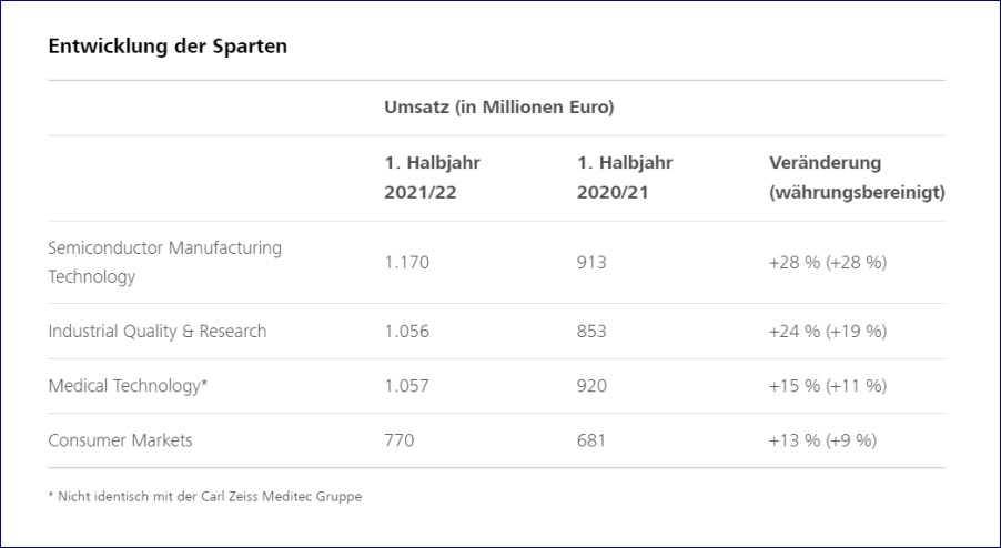 Die positive Entwicklung bei der Sparte Medical Technology setzte sich im ersten Halbjahr 2021/22 fort, die Markterholung hat global bereits das Niveau vor der Covid-19-Pandemie übertroffen. Der Auftragseingang sei laut Zeiss auf hohem Niveau mit anhaltend ansteigendem Auftragsbestand. Der Umsatz wuchs im prozentual zweistelligen Bereich trotz anhaltender Engpässe in den Lieferketten und der Materialbeschaffung.
