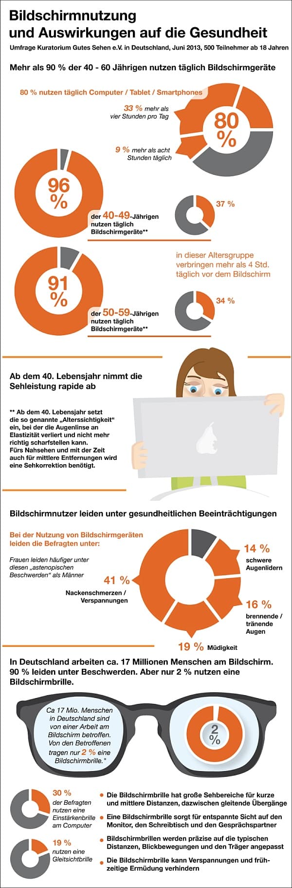 Etwa ab dem 55. Lebensjahr steigt die Alterssichtigkeit auf über +1,5 Dioptrien an. Einstärken-Brillen reichen dann nicht mehr aus, und die normalen Gleitsicht-Brillen für den Alltag haben einen zu schmalen Korrektionsbereich für die Monitordistanz. Die beste Lösung sind Bildschirm-Brillen mit Gleitsichtfunktion. Sie decken die unterschiedlichen Entfernungen bei der Computerarbeit ab. „Hierfür sollten vor dem Besuch im Augenoptik-Fachgeschäft die Entfernungen zum Monitor, zur Tastatur und zum Blatt auf dem Schreibtisch ausgemessen werden“, empfiehlt Dr. Wesemann.