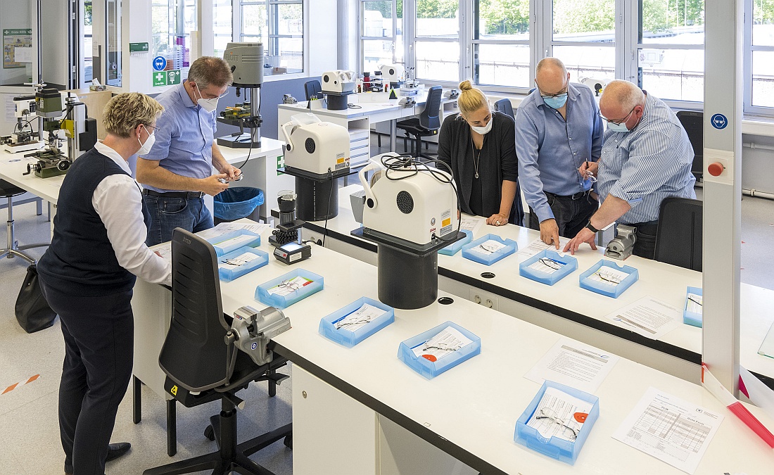 An drei Stationen mussten die Teilnehmer*innen verschiedene Aufgaben aus dem Augenoptikeralltag bewältigen – Corona bedingt unter strengen Hygieneauflagen – und eine randlose Brille nach bestimmten Kundenwünschen verglasen, ein fiktives Beratungsgespräch mit Berücksichtigung einer beginnenden Augenerkrankung führen und schließlich unterschiedliche Fehler bei einer Gleitsichtbrille finden und diese korrigieren. Die entsprechenden Fassungen, Brillengläser bzw. vergrößernden Sehhilfen wurden von den Firmen Zeiss, Flair und Schweizer zur Verfügung gestellt.