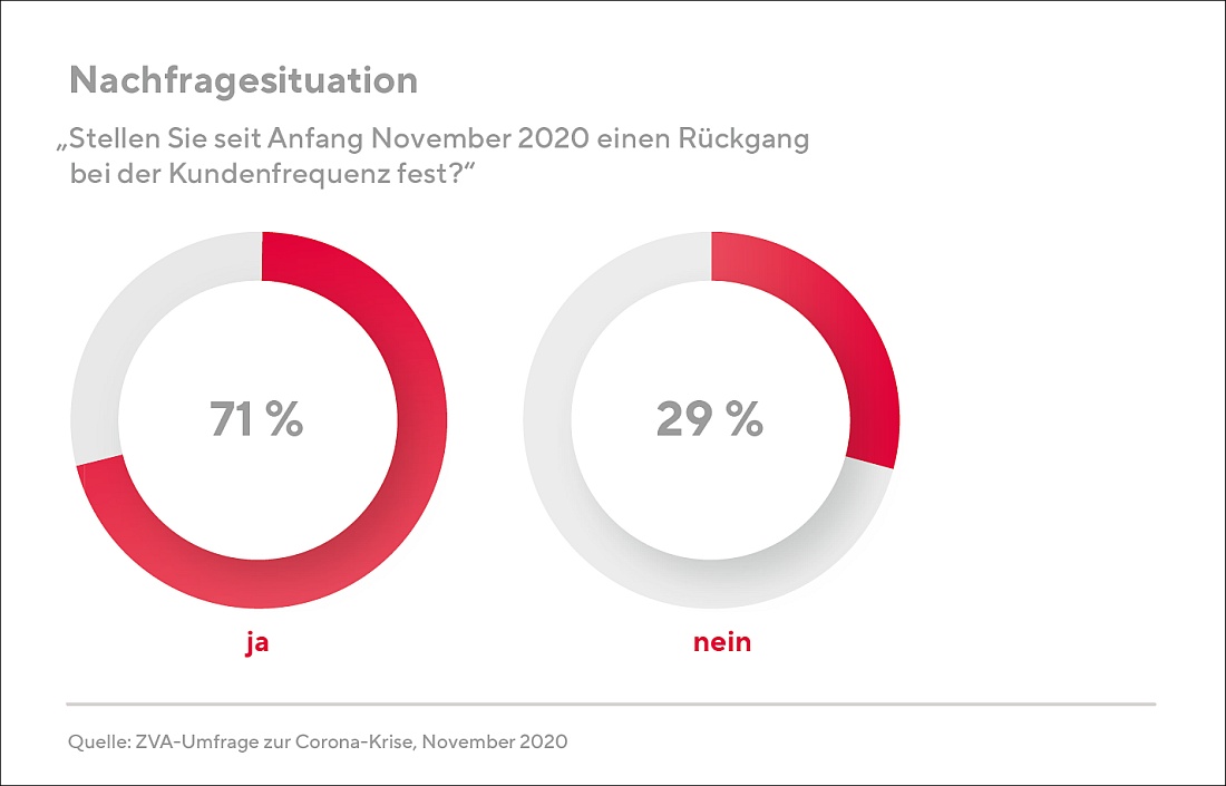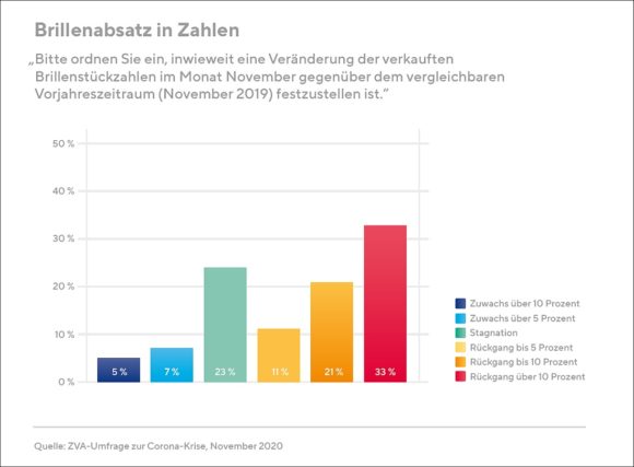 Insgesamt 838 Betriebe aus der gesamten Bundesrepublik nahmen an der vom 16. bis 23. November laufenden ZVA-Umfrage teil. Knapp 90 Prozent der befragten Betriebsinhaber hatten ihre Öffnungszeiten in den Monaten September und Oktober bereits wieder an das Vorkrisenniveau angepasst und nur ein kleiner Teil (5,19 Prozent) verkürzte diese aufgrund des erneuten Teil-Lockdowns. Gleichwohl bemerkten 71 Prozent der Betriebe im November einen Rückgang bei der Kundenfrequenz und knapp zwei Drittel verzeichneten einen gegenüber dem Vorjahresmonat nachlassenden Brillenabsatz.
