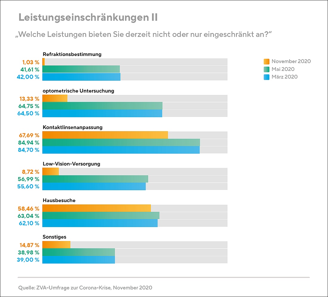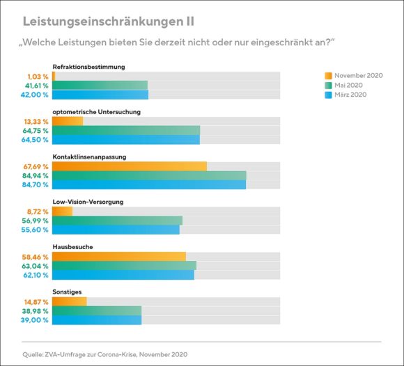 Auch das Leistungsangebot erfährt bei rund drei Vierteln der Betriebe keinerlei Einschränkungen mehr. Werden Dienstleistungen derzeit nicht angeboten, handelt es sich dabei vorrangig um Kontaktlinsenanpassungen und Hausbesuche.