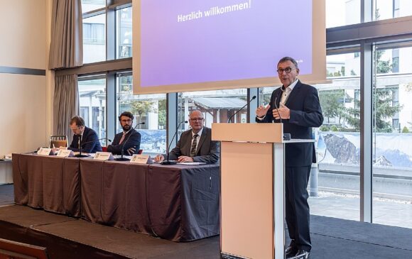 Obermeistertagung – auf dem Podium (von links): ZVA-Vizepräsident Kai Jaeger, ZVA-Geschäftsführer Dr. Jan Wetzel, ZVA-Vizepräsident Armin Ameloh und (am Rednerpult) ZVA-Präsident Christian Müller (Bild: ZVA/Peter Magner)