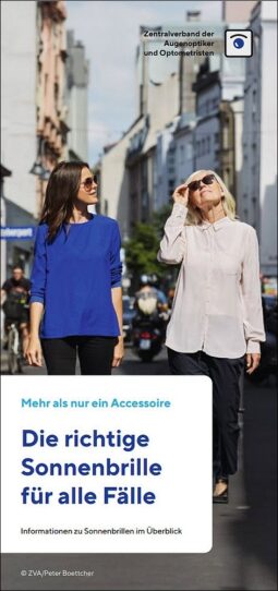Insbesondere beim stationären Augenoptiker wird laut ZVA individuelle Beratung groß geschrieben. Daher stellt der Zentralverband der Augenoptiker und Optometristen den Innungsbetrieben einen Flyer zur Verfügung, der über den Sonnenschutz für die Augen und die damit zusammenhängende Dienstleistung des Augenoptikers aufklärt. Innungsbetriebe können den Flyer im Betrieb auslegen oder den Kunden direkt aushändigen.